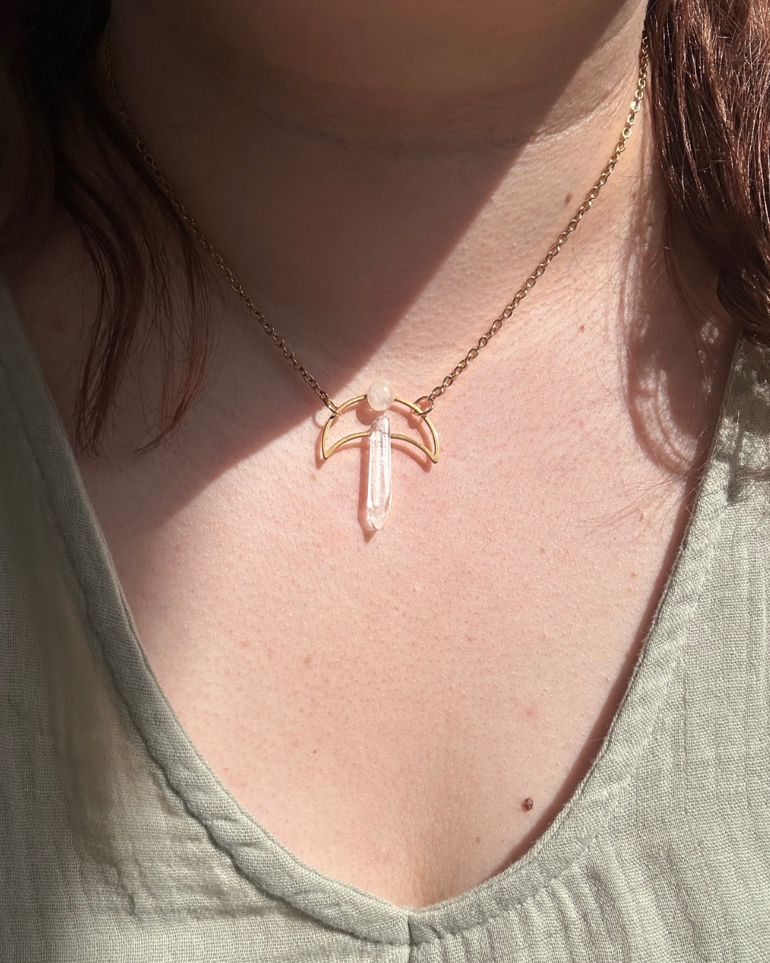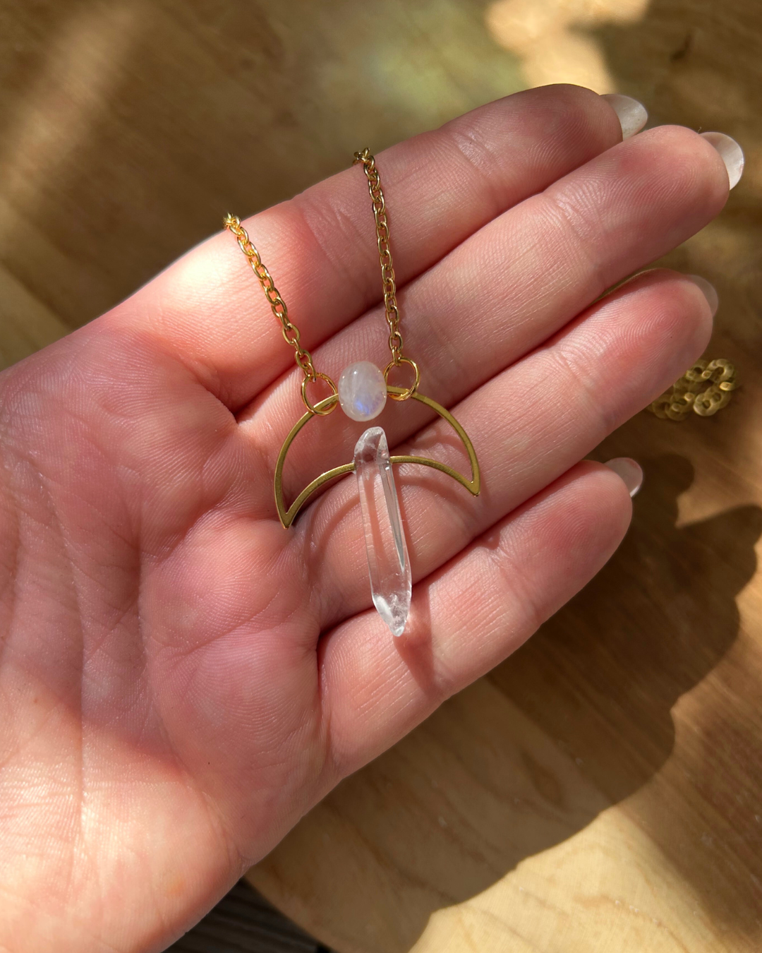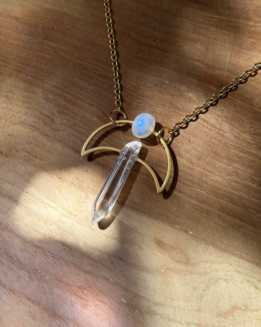 Naszyjnik z kolekcji "Magiczne Amulety". To magiczna kompozycja łącząca sobie dwa minerały - Kryształ Górski, czyli "kamień matkę" wielu minerałów oraz Kamień Księżycowy z wyjątkową niebieską poświatą, która daje o sobie znać, gdy naszyjnik jest w ruchu. Oba kamienie połączył ze sobą symbol księżyca.