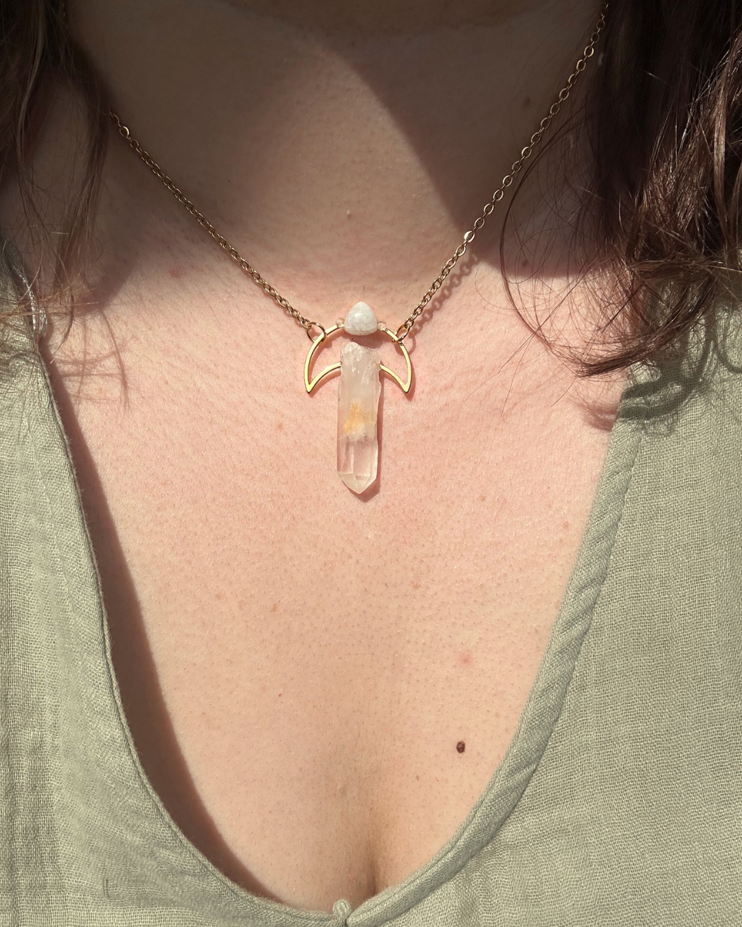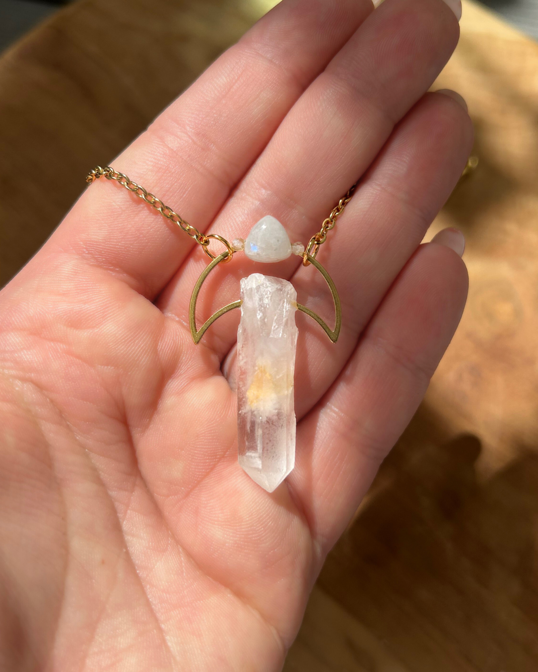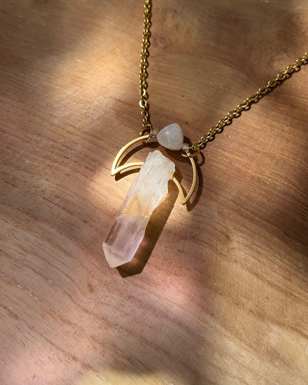 Naszyjnik z kolekcji "Magiczne Amulety". To magiczna kompozycja łącząca sobie dwa minerały - Kryształ Górski, czyli "kamień matkę" wielu minerałów (w tym naszyjniku, posiada unikalny wrost masy skalnej w kolorze pasującym do całości zawieszki) oraz Kamień Księżycowy z uroczym niebieskim błyskiem, który daje o sobie znać, gdy naszyjnik jest w ruchu. Oba kamienie połączył ze sobą symbol księżyca.