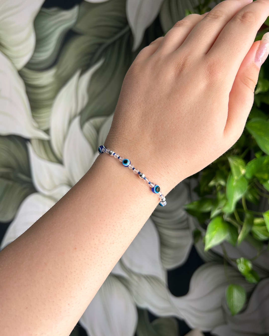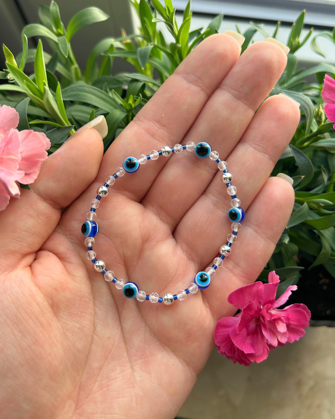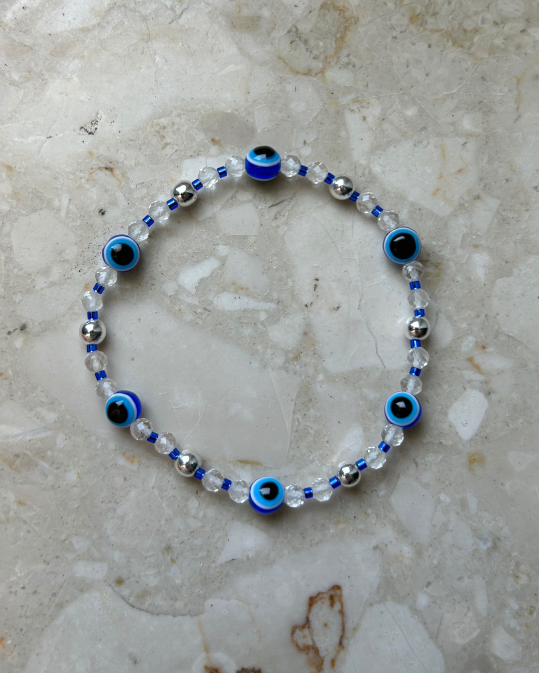 Bransoletka z kolekcji "Lekkość lata". Kompozycja z jednego z wakacyjnych symboli - oko proroka, czyli popularny turecki motyw wykorzystywany w biżuterii i elementach wystroju domu. Według tradycji chroni przed "złym spojrzeniem". Bransoletka składa się z prawdziwych tureckich koralików, które uzupełniają hematyt, szkło oraz fasetowany kryształ górski.