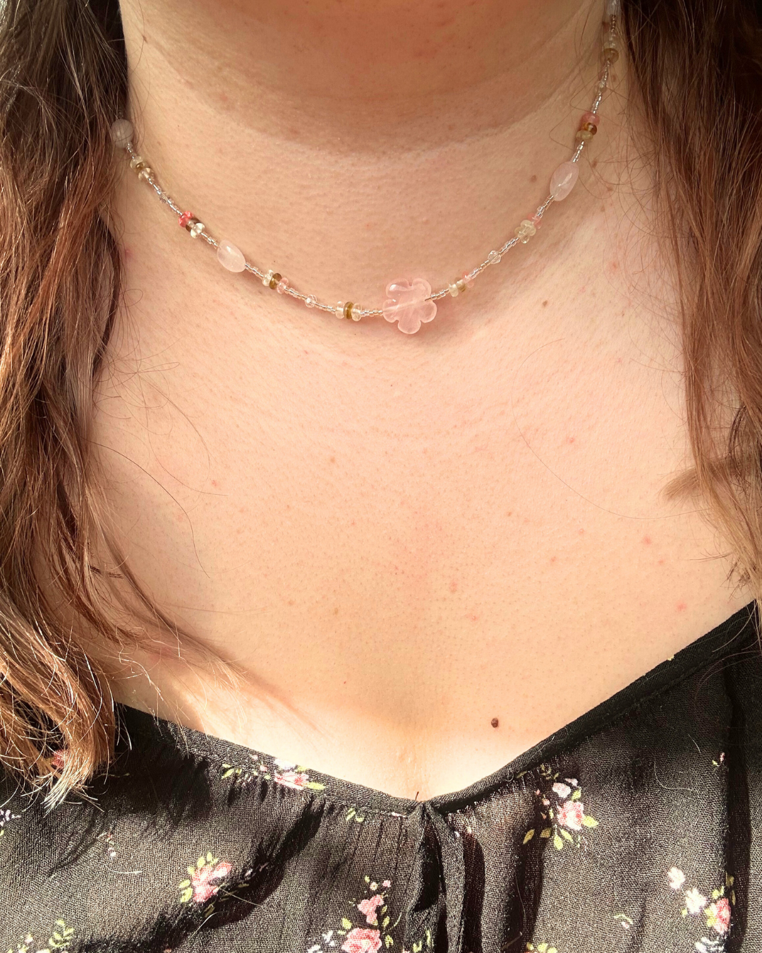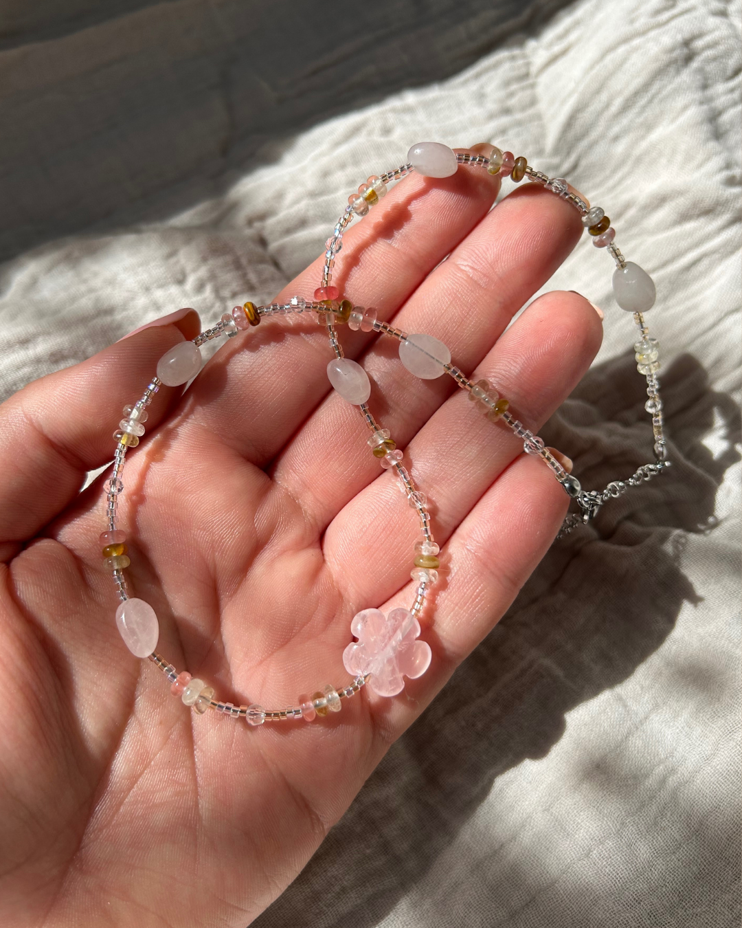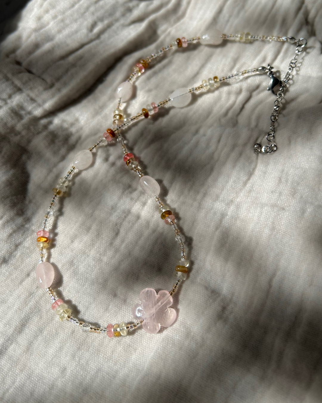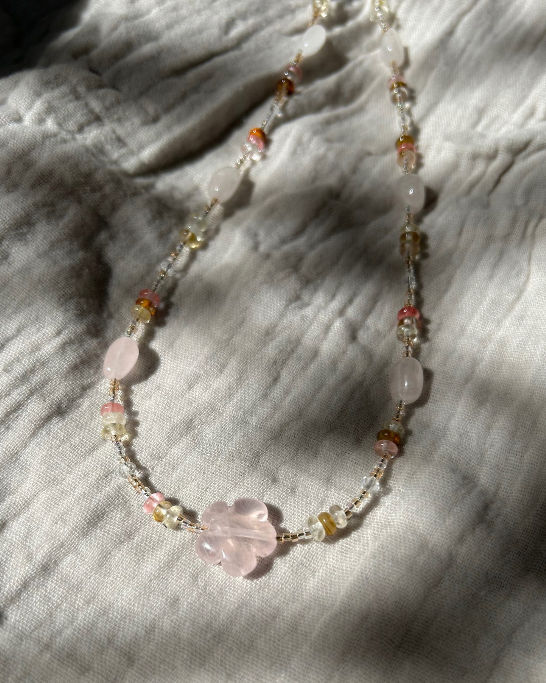 Naszyjnik z kolekcji "FLORAL". To urocza i delikatna kompozycja skupiona wokół kwarcu różowego. Głównym elementem jest kwiat z tego minerału, a uzupełniają go mniejsze, nieregularne bryłki. Całość uzupełniają lśniące koraliki szklane oraz wyjątkowe oponki z wielobarwnego kwarcu arbuzowego.