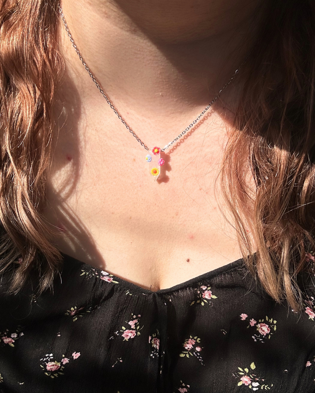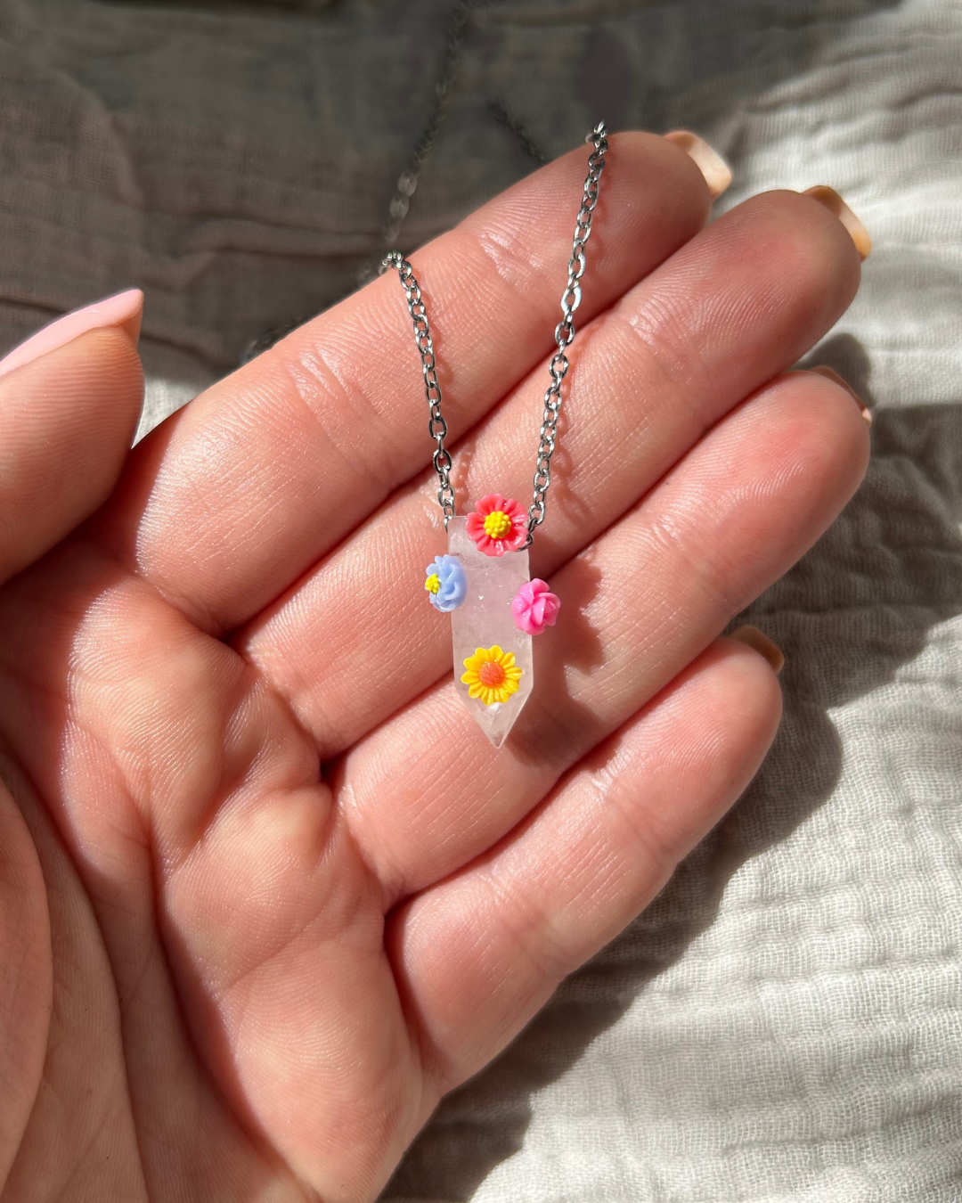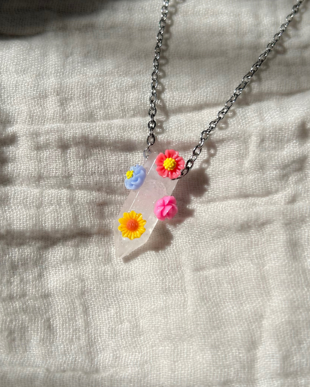 Naszyjnik z kolekcji "FLORAL". Zawieszkę z kryształy górskiego w kształcie grotu otoczyły kolorowe kwiaty. To Twój osobisty mini ogródek (do tego całoroczny i nie wymaga podlewania!). Nietuzinkowy dodatek do codziennego noszenia, aby dosypać szczyptę koloru do szarości.