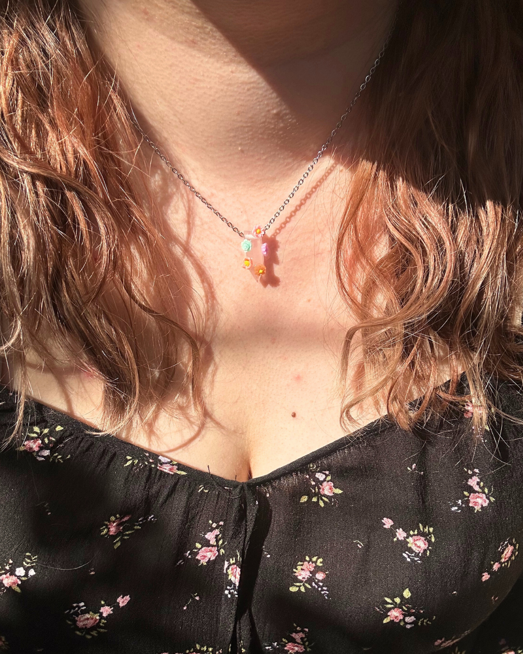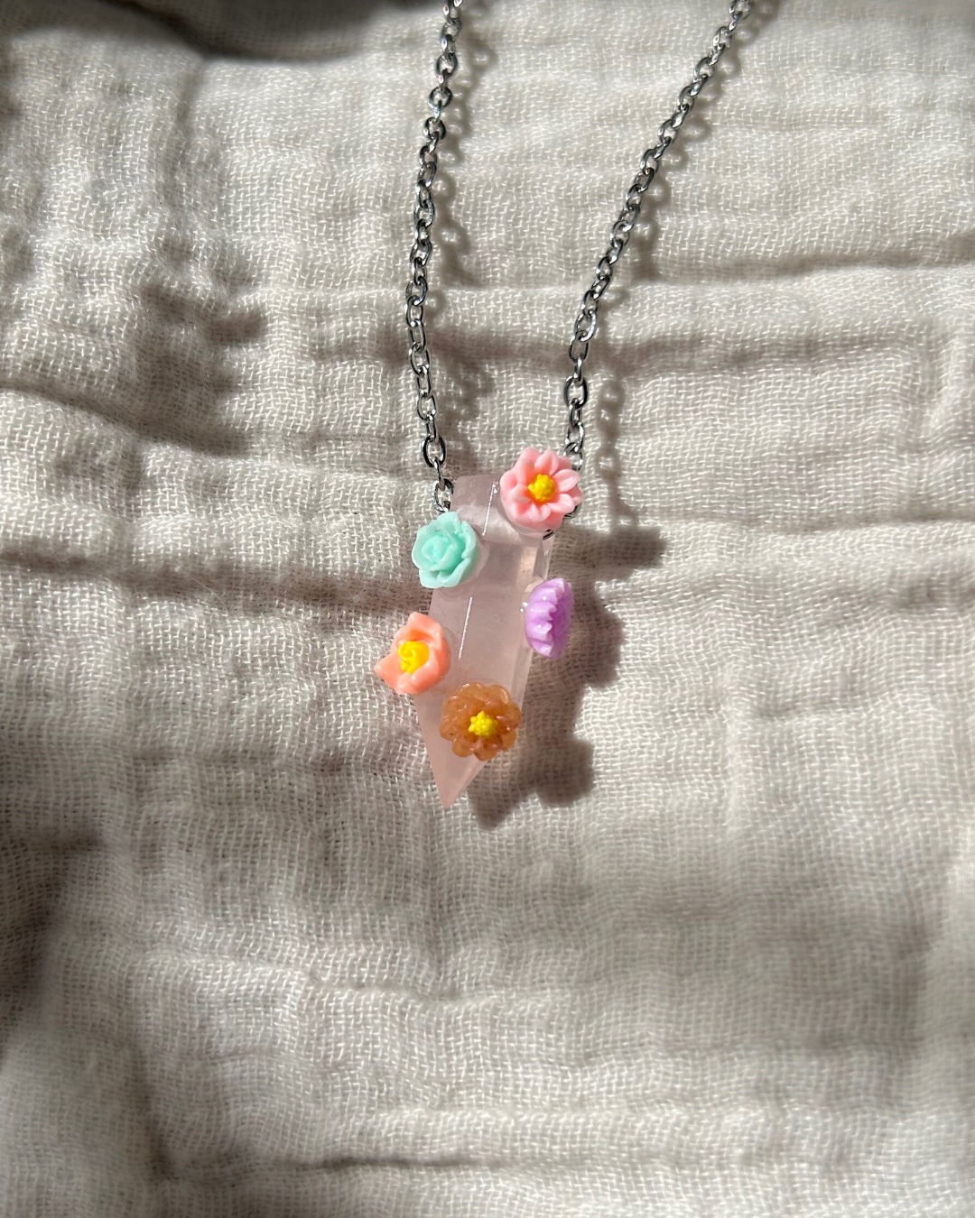 Naszyjnik z kolekcji "FLORAL". Zawieszkę z kwarcu różowego w kształcie grotu otoczyły kolorowe kwiaty. To Twój osobisty mini ogródek (do tego całoroczny i nie wymaga podlewania!). Nietuzinkowy dodatek do codziennego noszenia, aby dosypać szczyptę koloru do szarości.