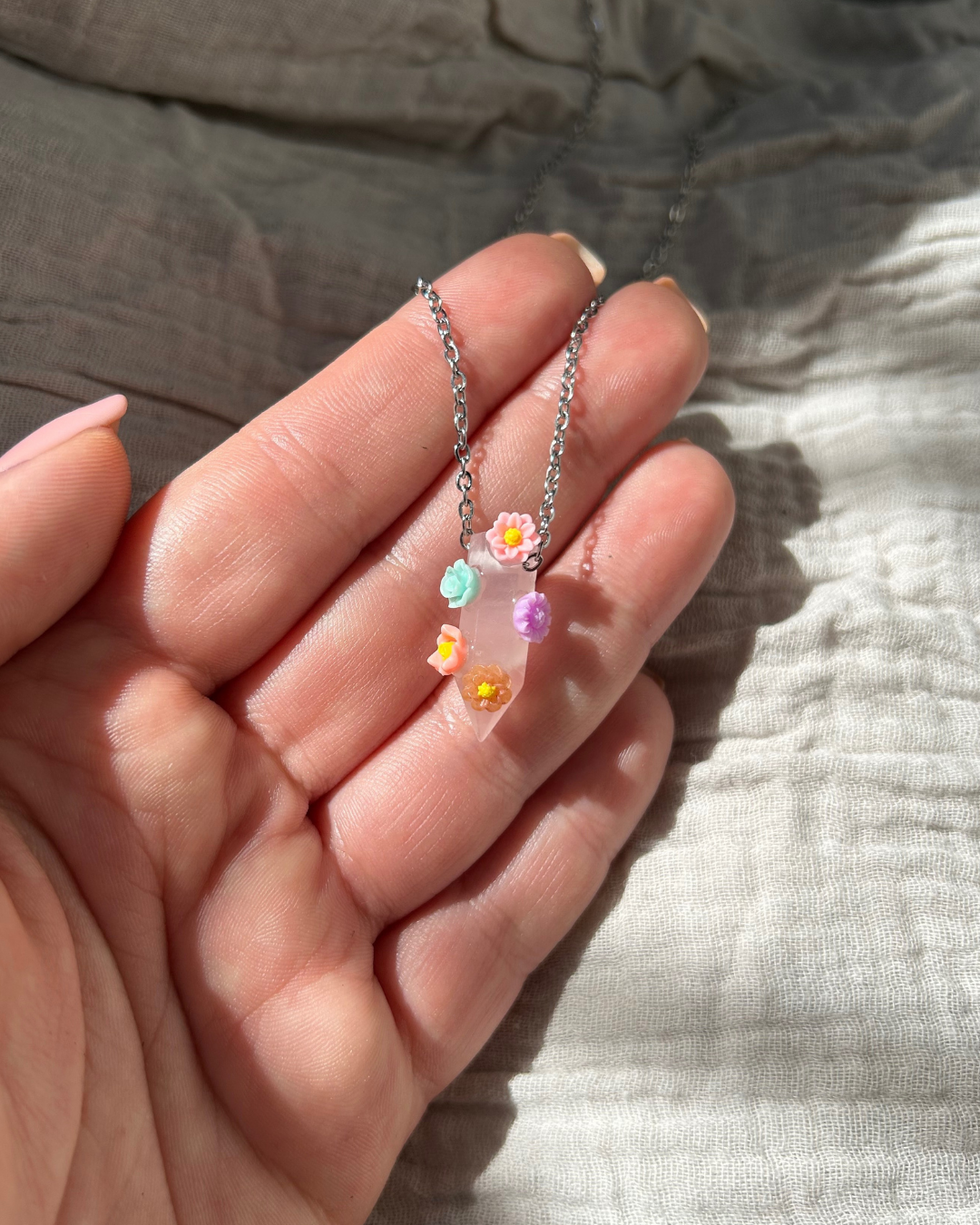 - Zawieszka z kwarcu różowego z kwiatami z żywicy