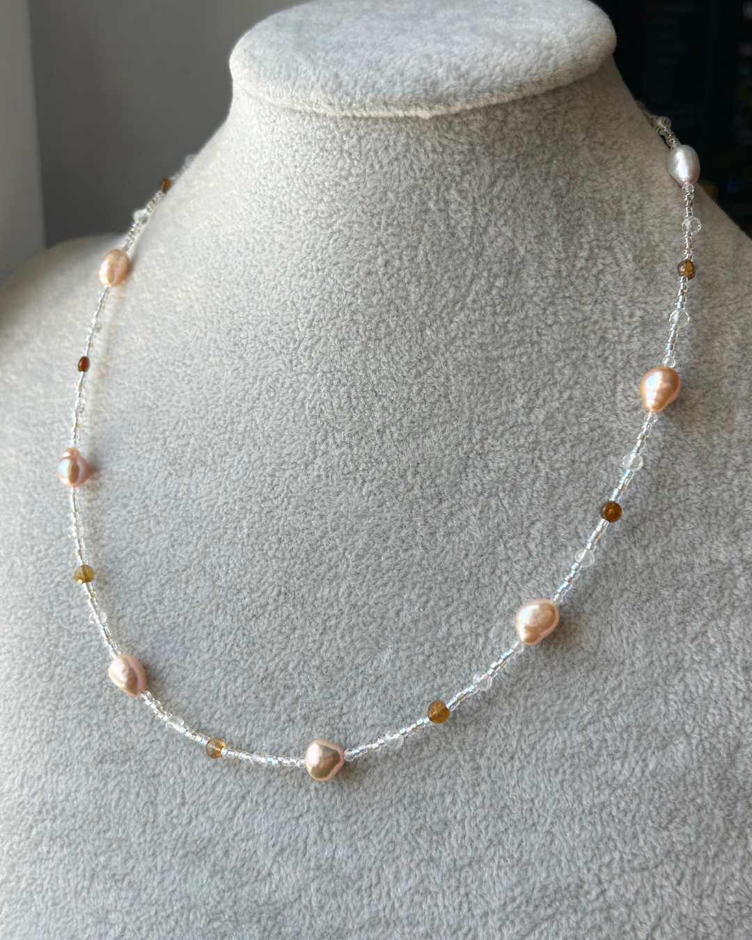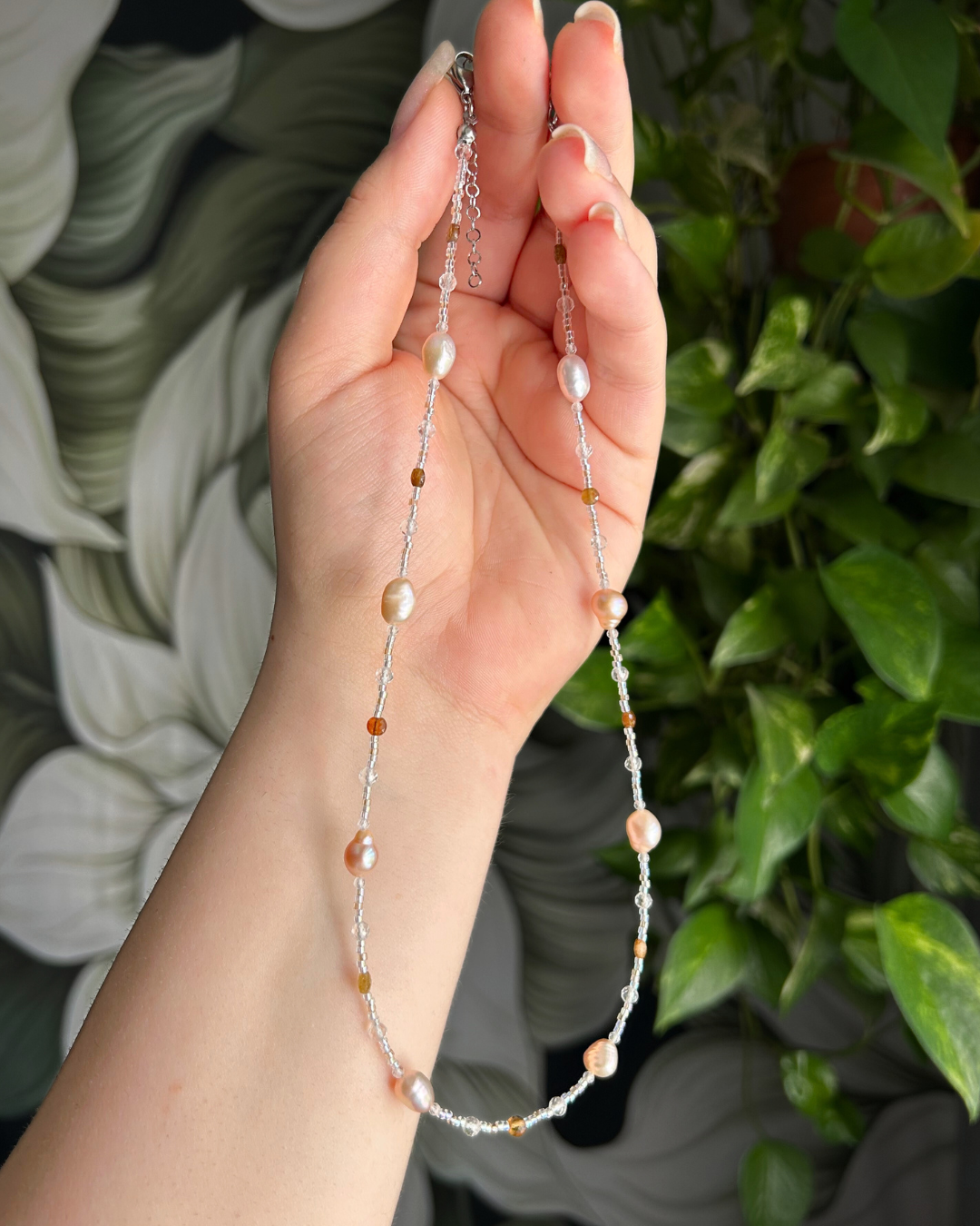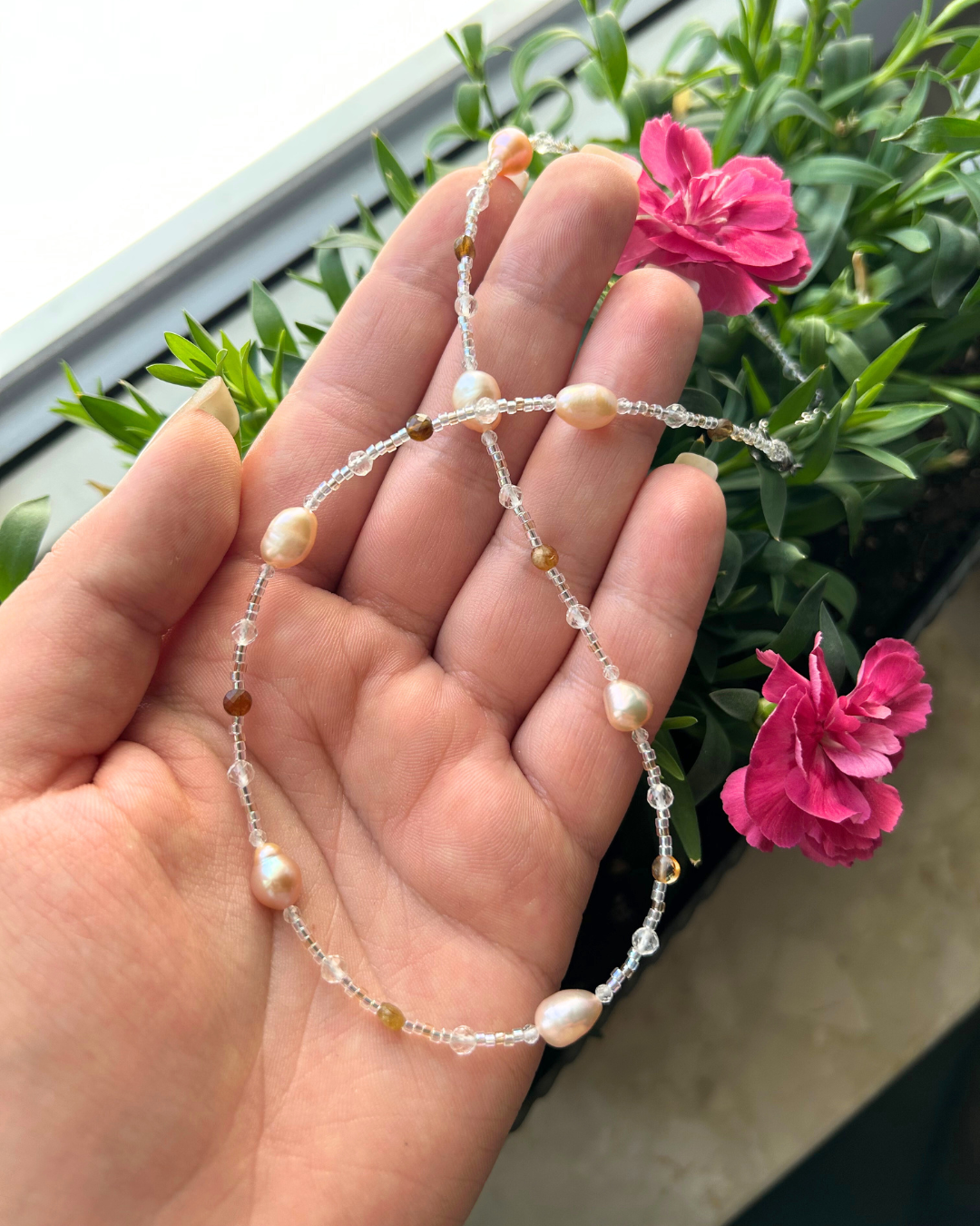 - Koraliki z turmalinu, kryształu górskiego i szkła oraz perły naturalne
