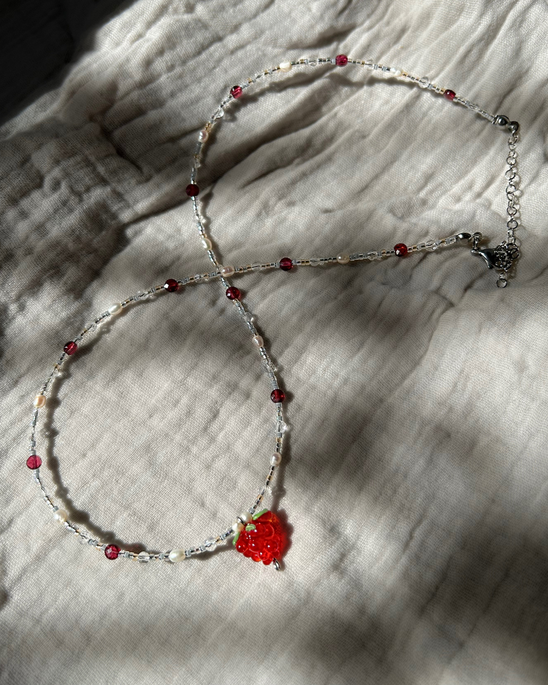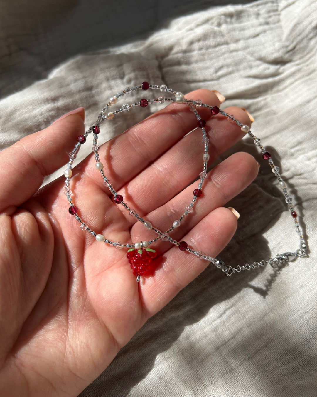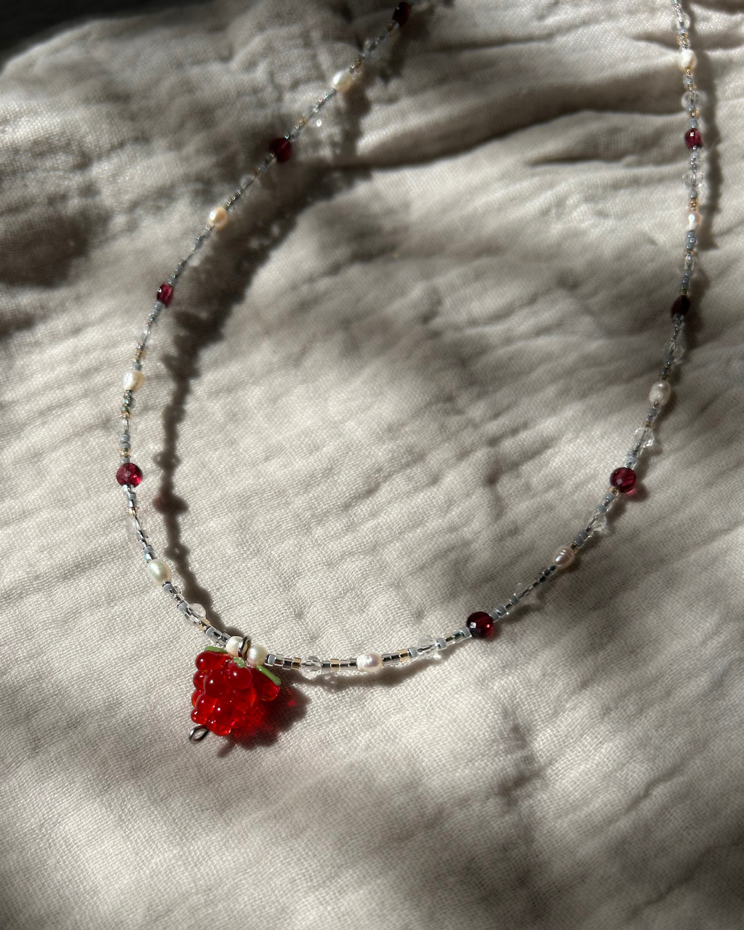 Naszyjnik z kolekcji "FLORAL". To urocza i delikatna kompozycja, której centrum stanowi szklana zawieszka w kształcie owocu maliny. Całość dopełniają błyszczące szklane koraliki, drobne perły słodkowodne oraz granat kolorem nawiązujący do motywu przewodniego.