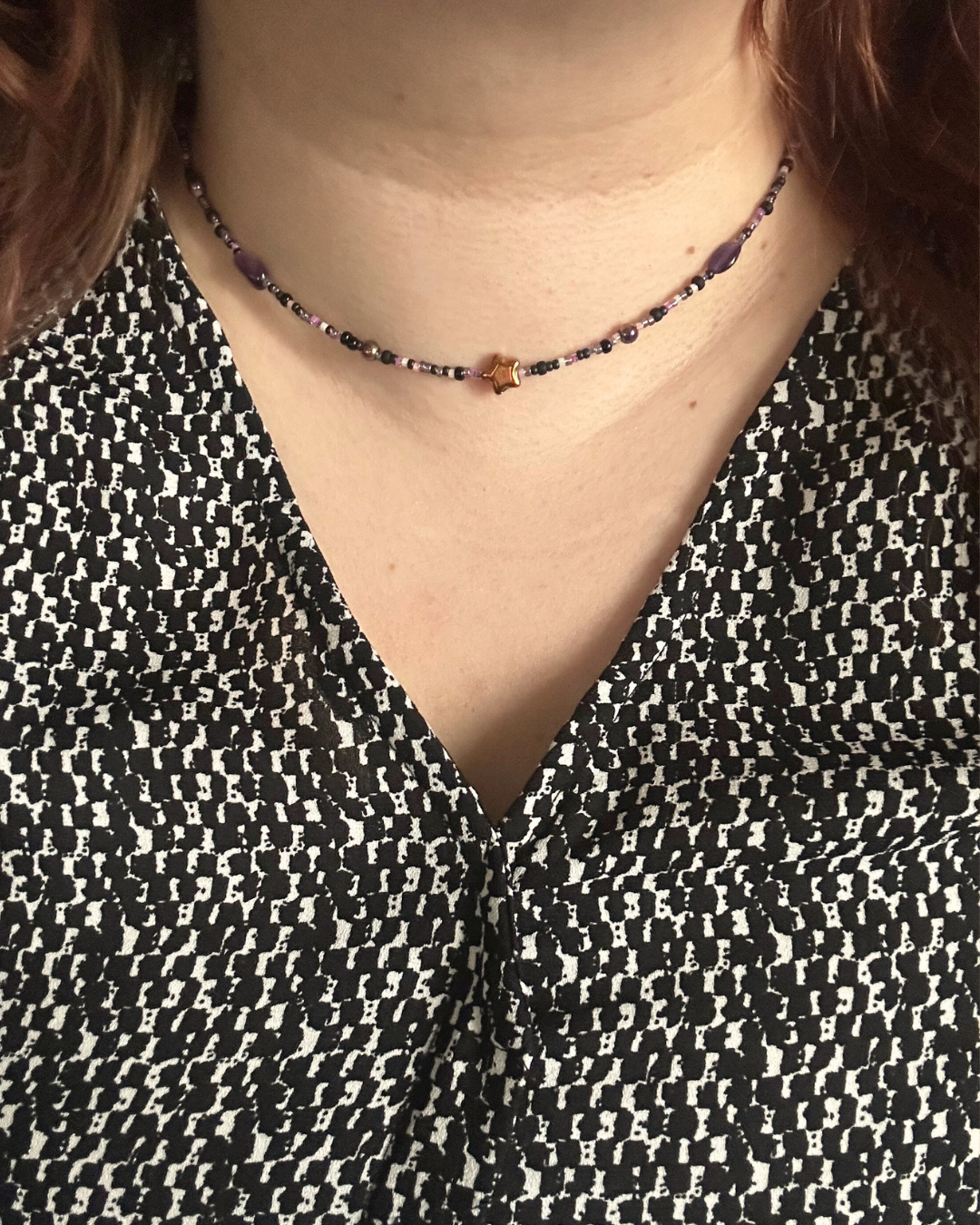 - Koraliki z ametystu, hematytu oraz szkła