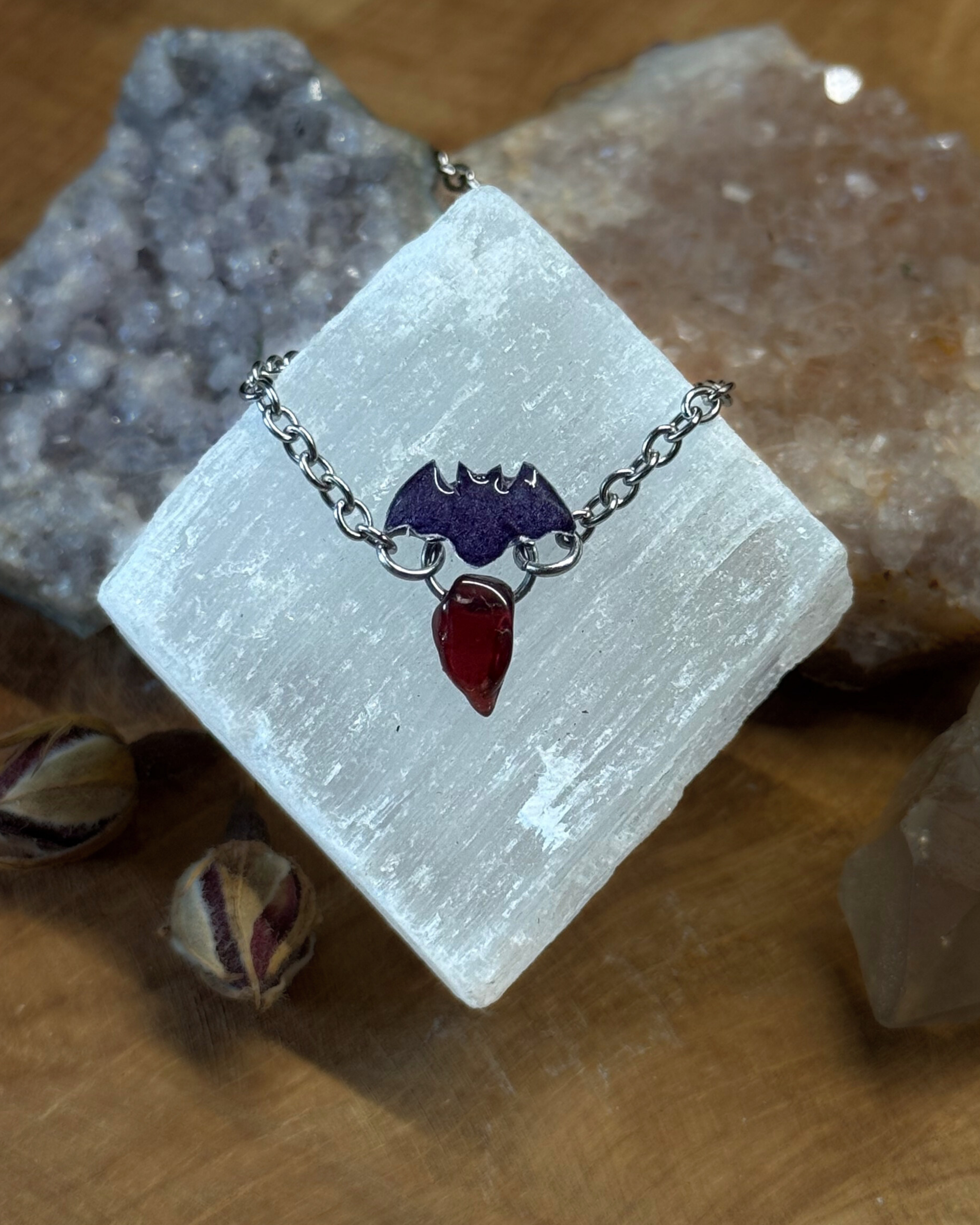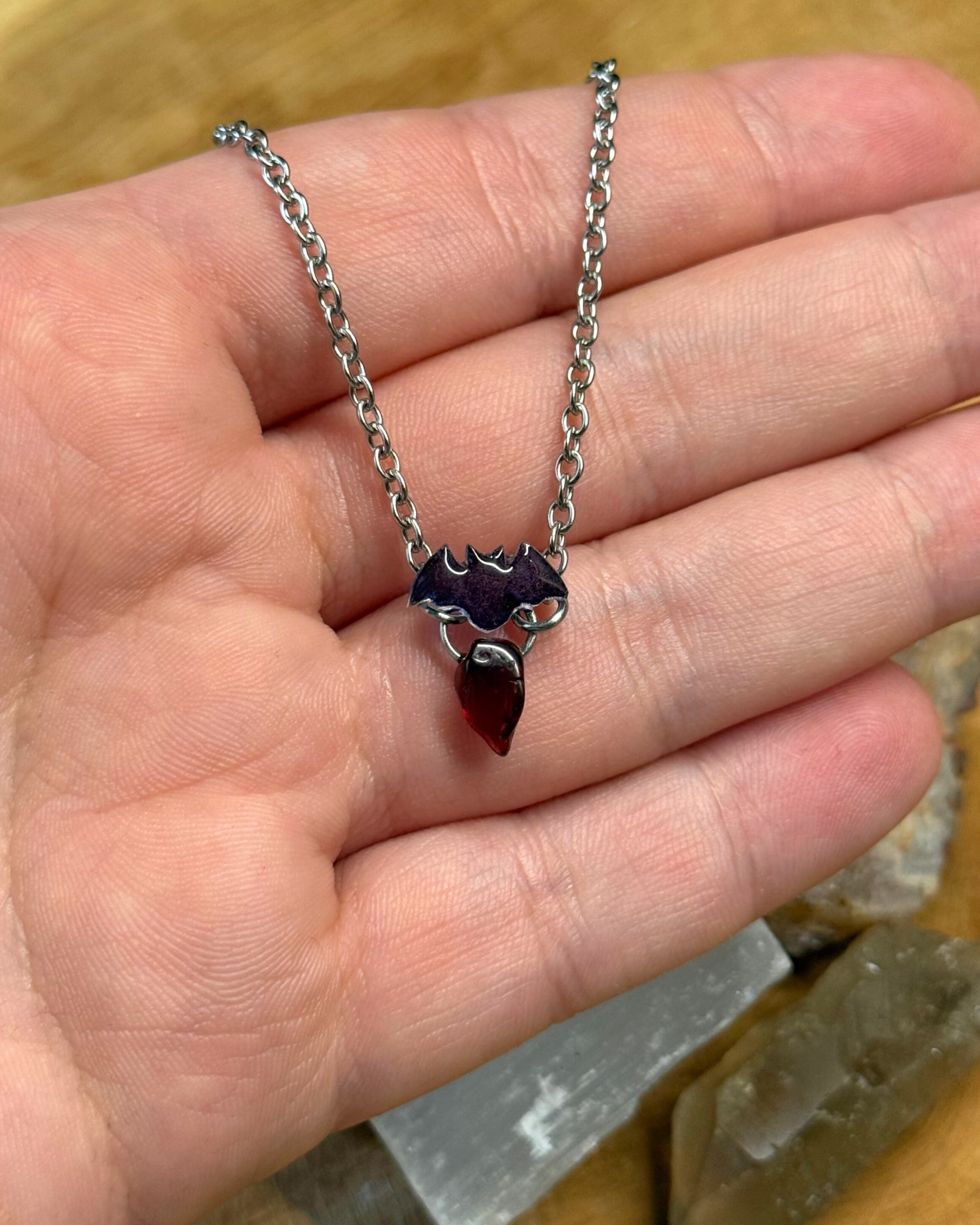 Naszyjnik z kolekcji "Twilight Shadows". Niesforny nietoperz wyleciał ze swojej jaskini i próbuje porwać do niej piękny Granat. Złap to uroczo-mroczne duo i niech stanie się Twoją wyjątkową biżuterią na co dzień i na wyjątkowe magiczne rytuały ;) Nietoperz został wykonany przeze mnie z folii termokurczliwej, która po obróbce staje się wytrzymałym materiałem, a dodatkowo została zabezpieczona żywicą.