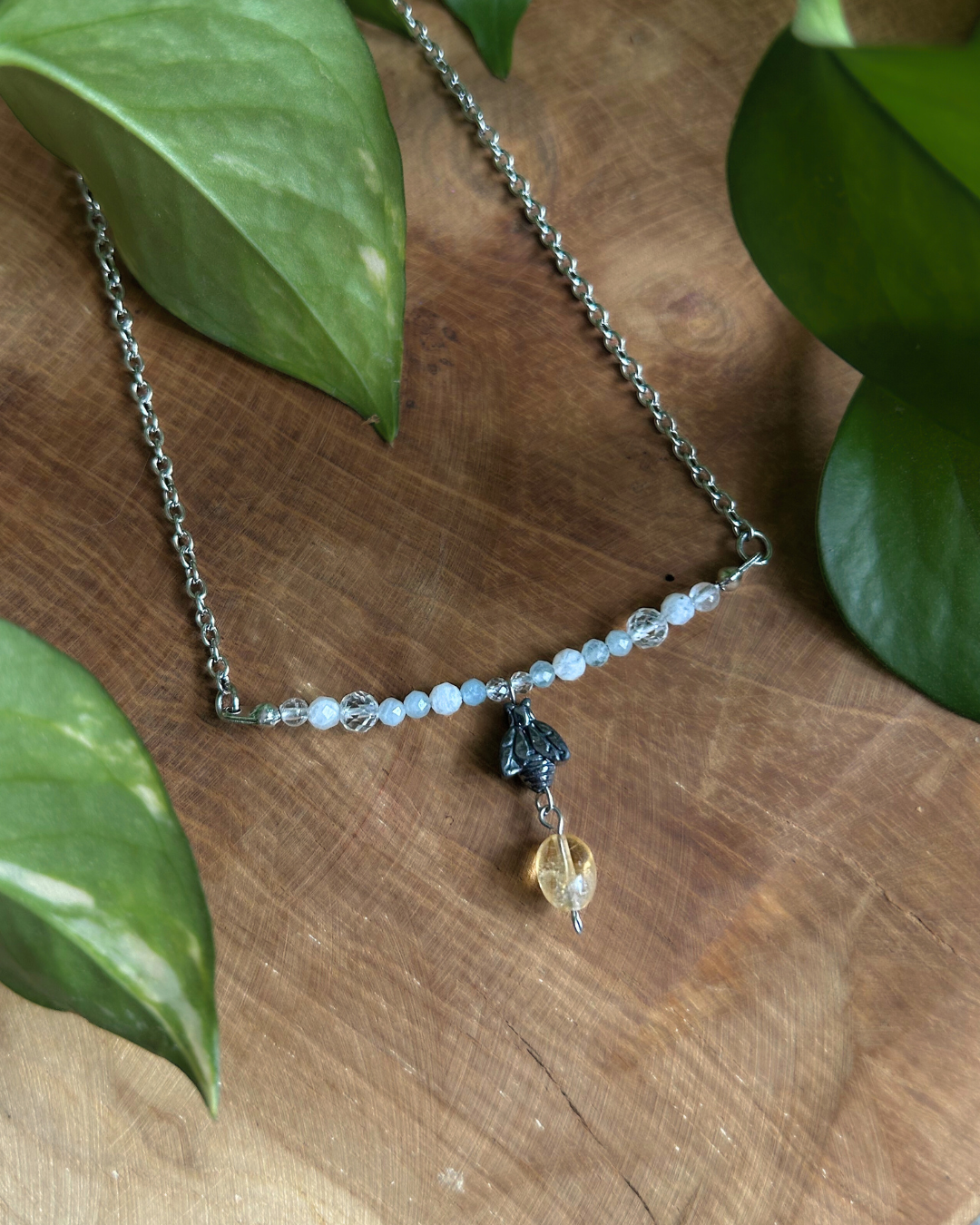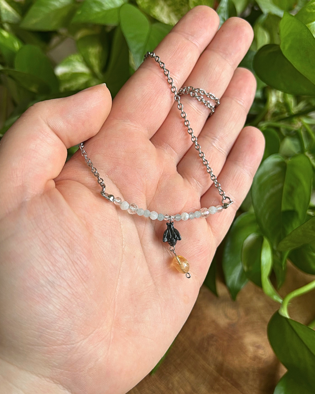 • Koraliki z kryształu górskiego, kamienia księżycowego, akwamarynu, topazu, szkła, cytrynu oraz hematytowa pszczółka