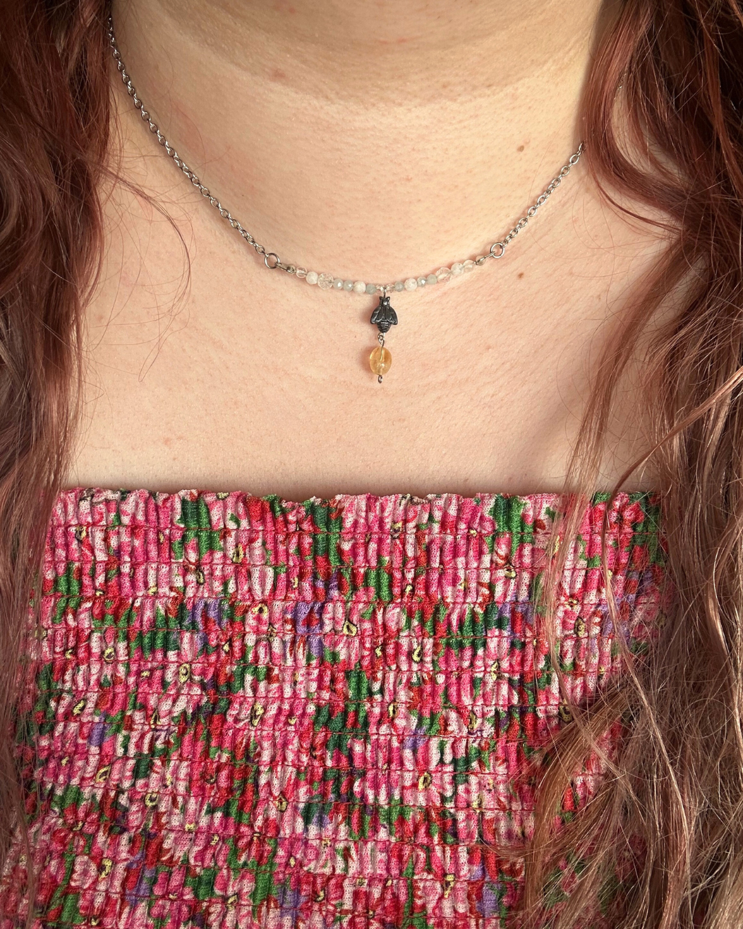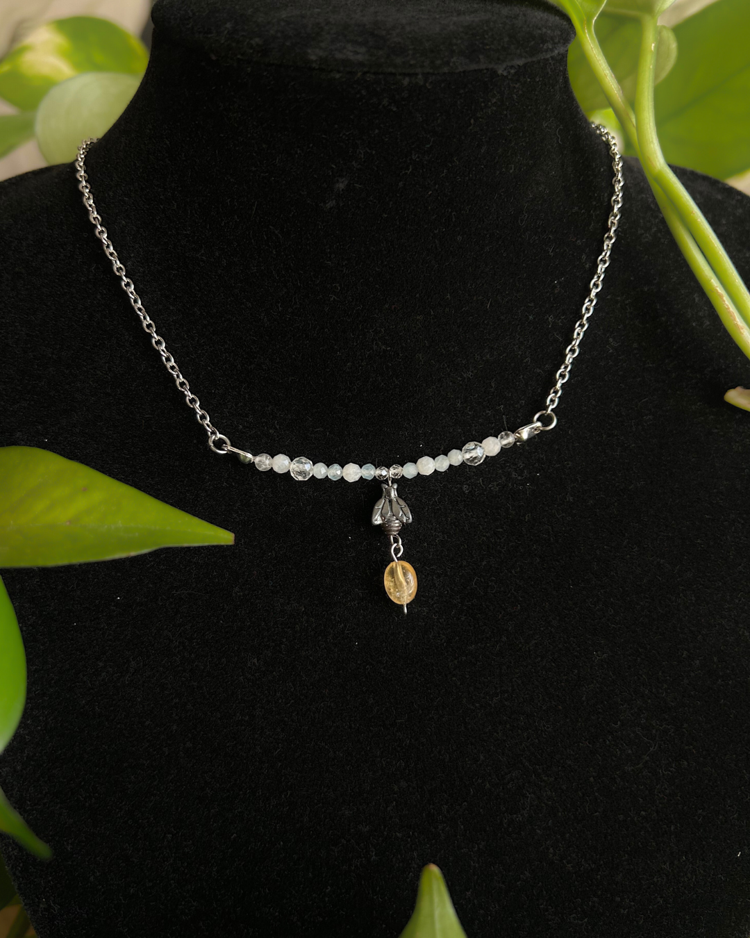 Naszyjnik z kolekcji "Wiosna". Kompozycja składa się z 3 elementów: niebo, pszczółka i miód. Niebo tworzy kryształ górski, kamień księżycowy, akwamaryn, topaz oraz szkło. Pszczółka zrobiona jest z hematytu, a miód symbolizowany jest przez cytryn. Całość tworzy urokliwą scenę i staje się nietuzinkowym naszyjnikiem, pełnym metafory spokoju, wolności i miłości do natury.