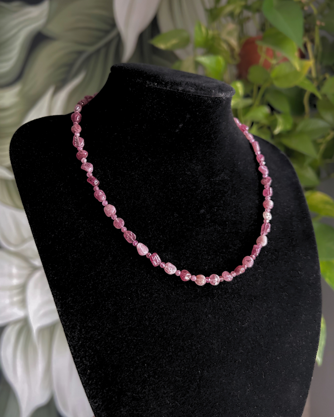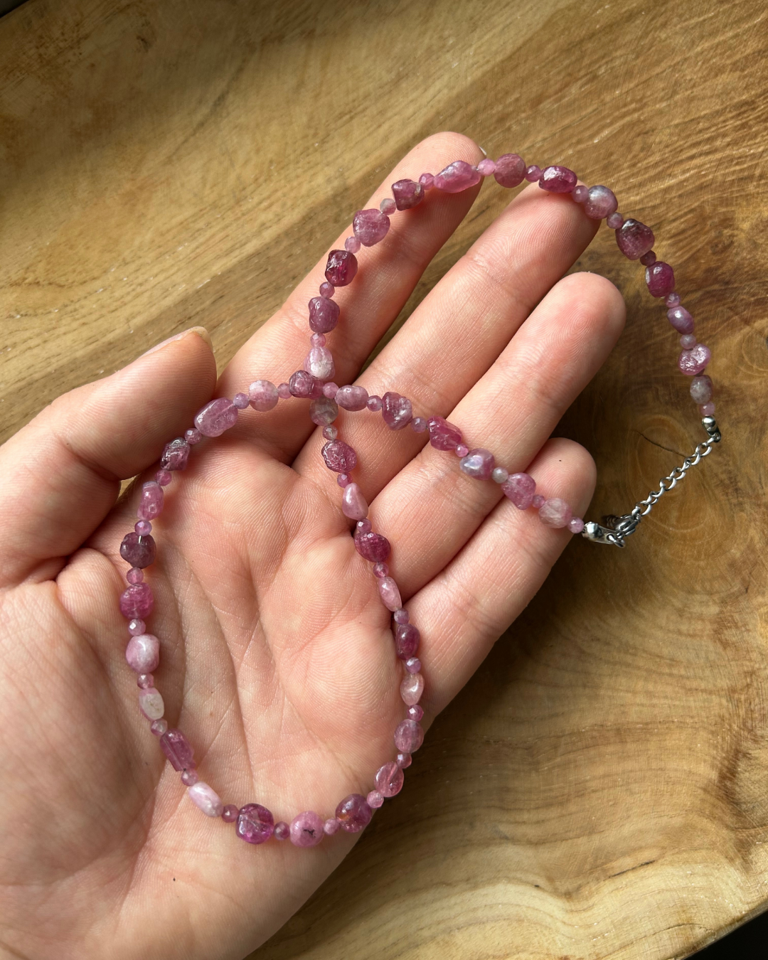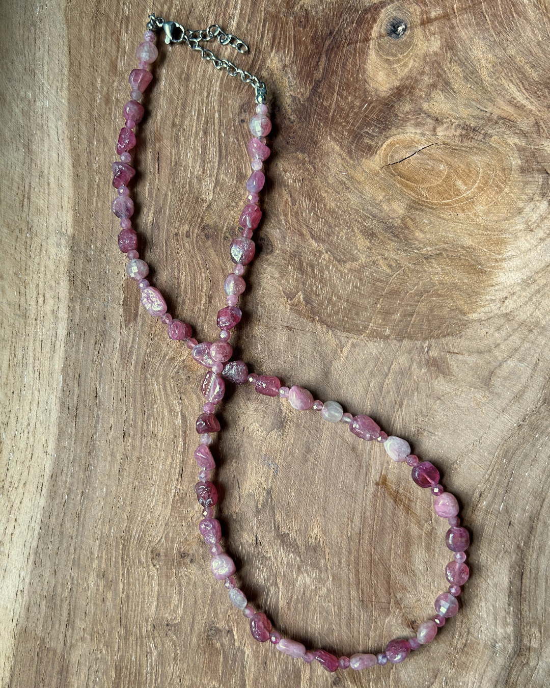 Naszyjnik z kolekcji "Monochrom". Piękno Turmalinu w najczystszej formie - aż 4 odsłony różowego minerału: fasetowane kuleczki i monety oraz bryłki gładkie i mocno nieregularne.