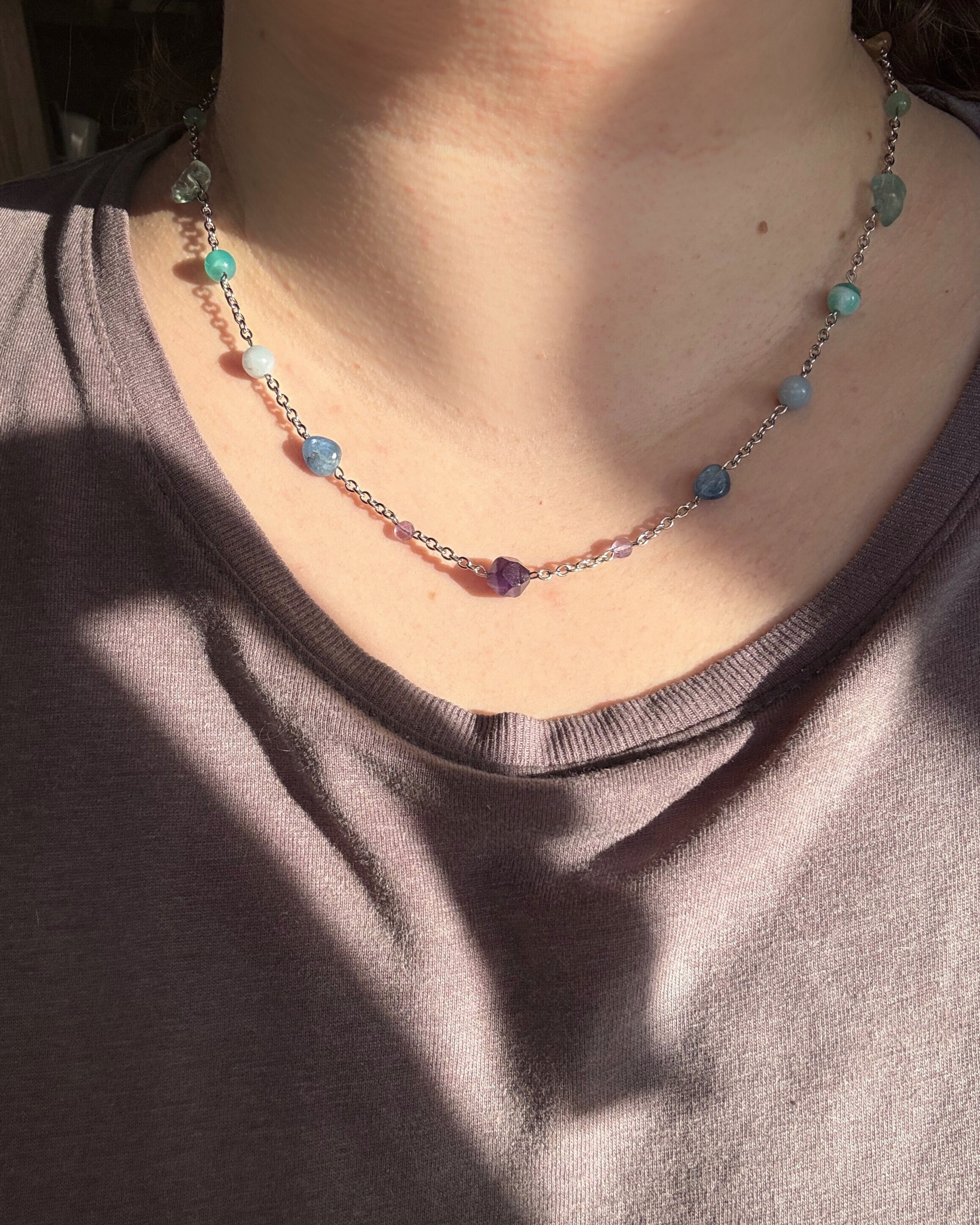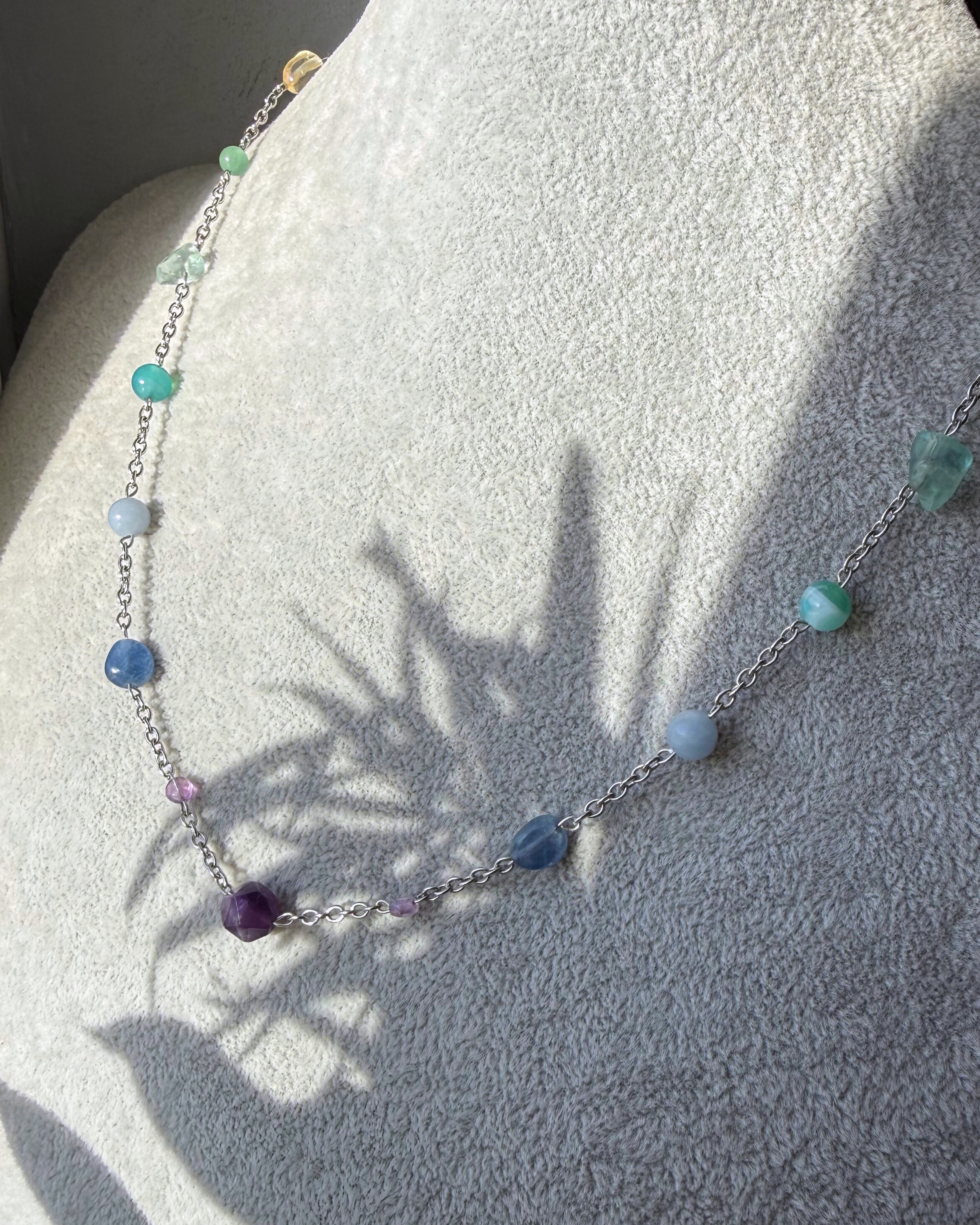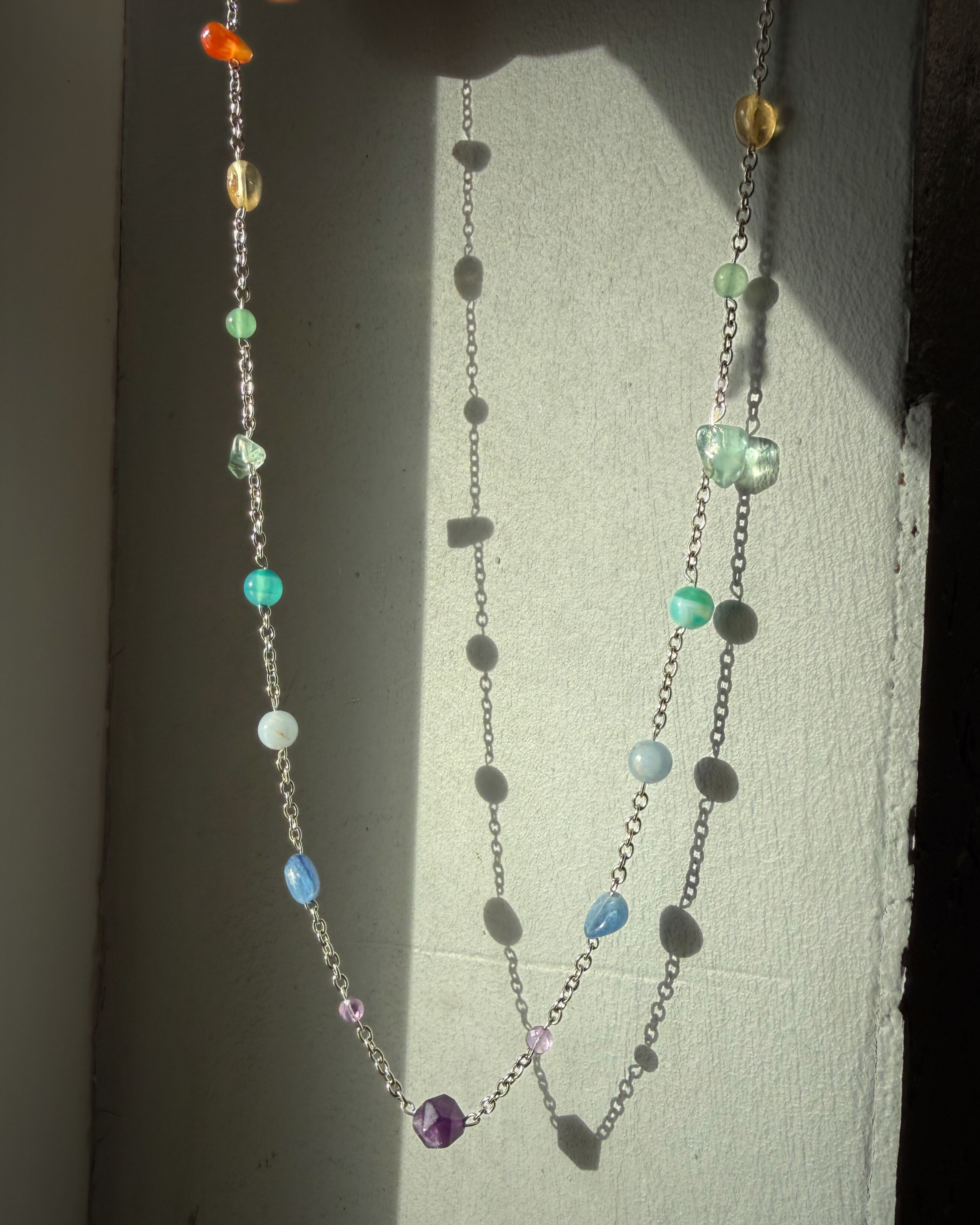 To kompozycja kilku różnych minerałów, które wspólnie tworzą magiczną tęczę. Kolor roznosi się po całej długości naszyjnika od ametystowego fioletu po krwistą czerwień granatu. W skład tęczowych minerałów wchodzą: ametyst, cyjanit, angelit, agat, fluoryt, awenturyn, cytryn, karneol i granat.