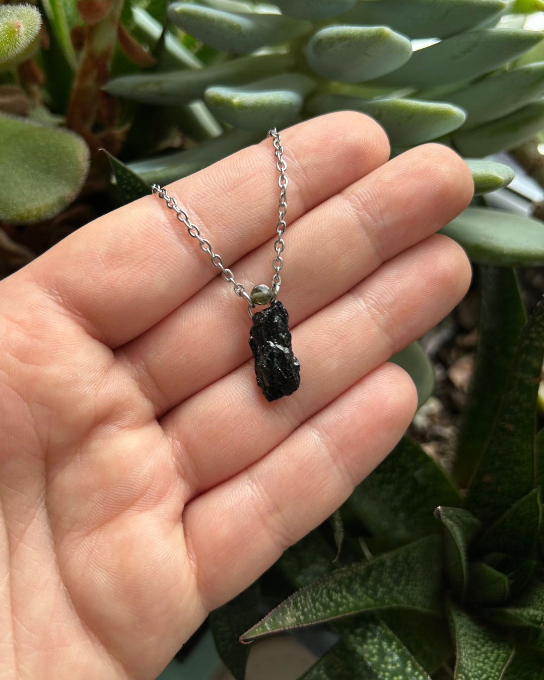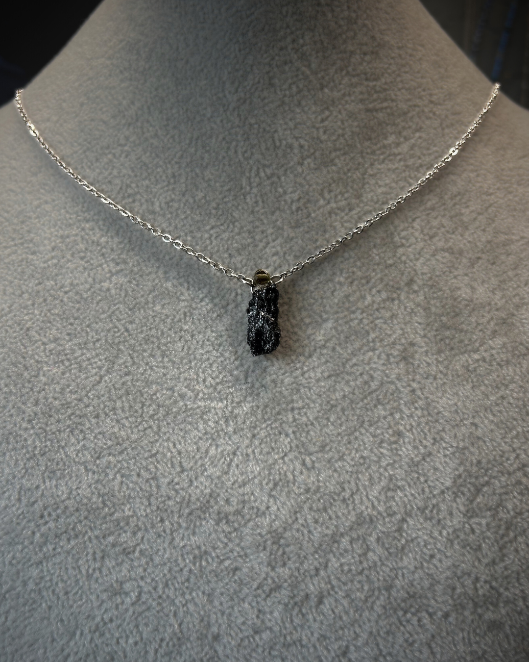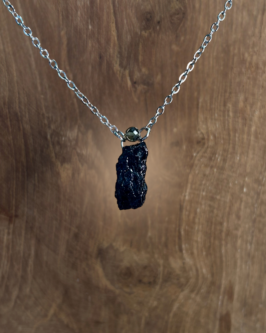 Naszyjnik z kolekcji "Mini Duety". Turmalinowe duo - niżej surowa bryłka, wyżej fasetowana moneta. Większy Turmalin zachwyca swoją głęboką czernią i błyszczącą powierzchnią, a komplementuje go mniejszy, pół-transparentny o lekko dymnej barwie. Tył zawieszki został zabezpieczony żywicą z błyskotliwymi drobinami, które są dodatkowym "sekretnym błyskiem". Rozmiar mini, wyjątkowość w wersji maxi.
