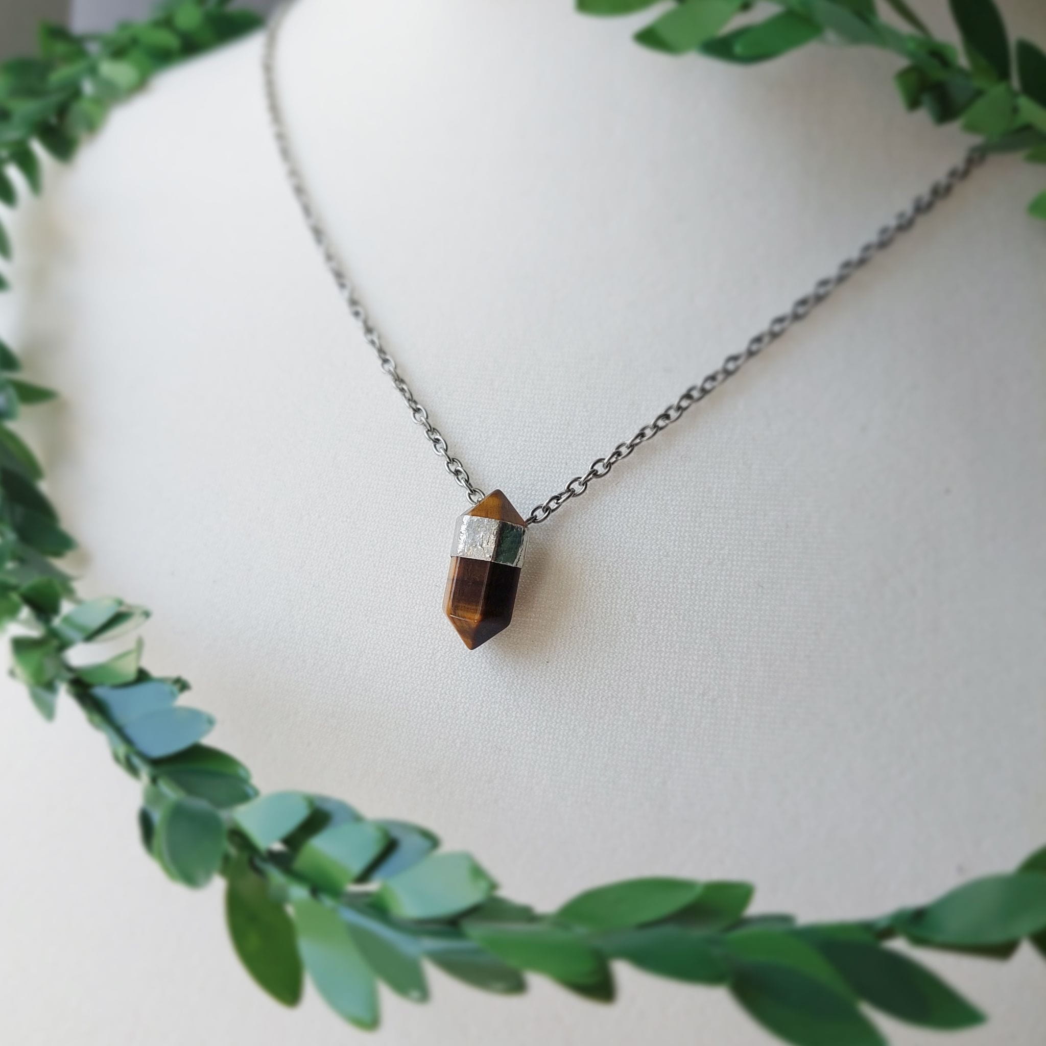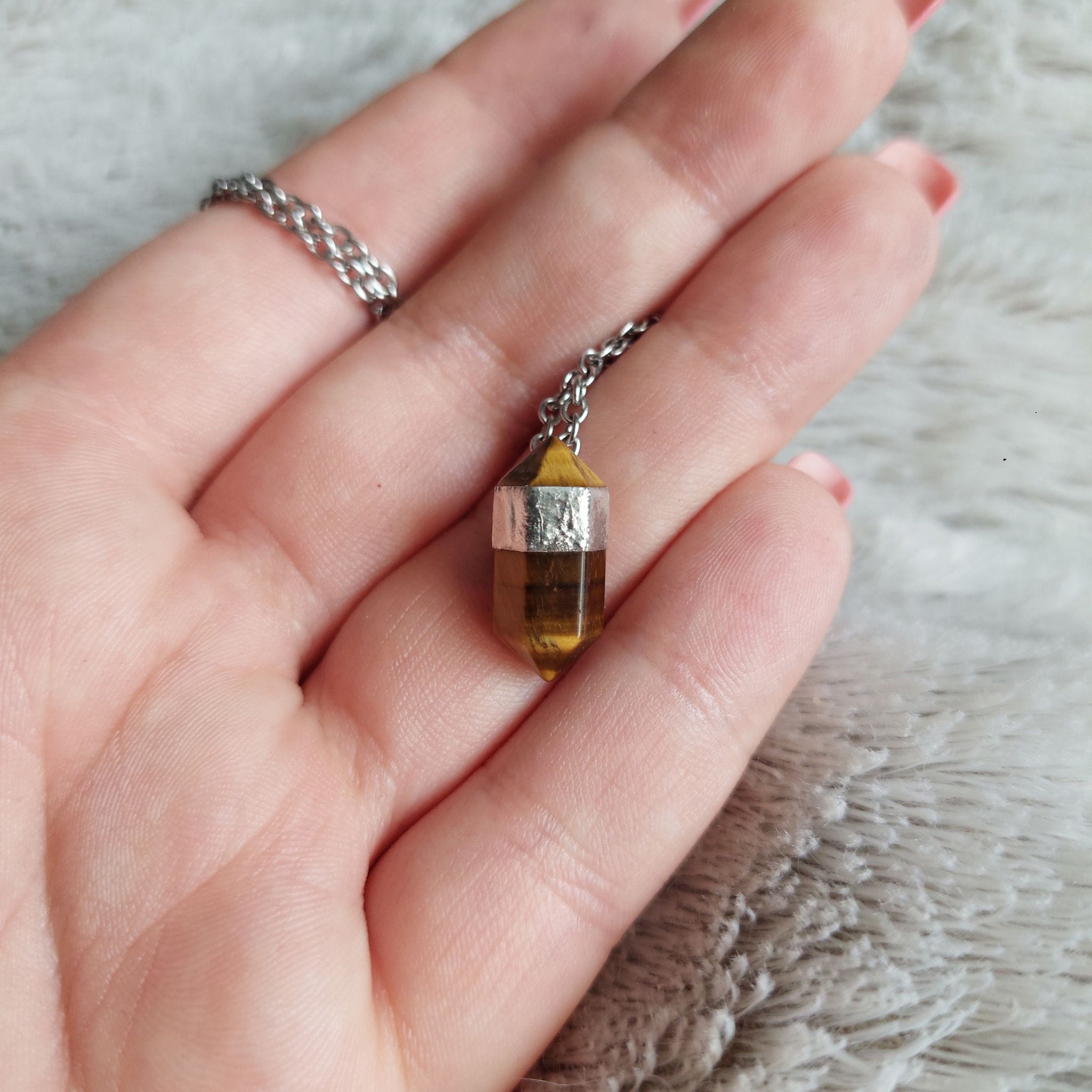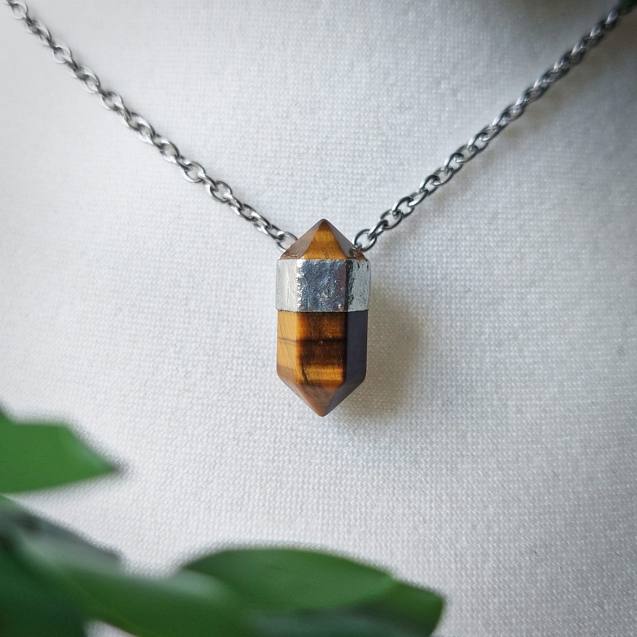 Naszyjnik z tygrysim okiem, szlifowanym w kształt modnego słupka. To minerał o niezwykłej strukturze, która jednym przypomina sierść dzikiego kota, a innym drewno. Jego szczególną cechą jest wyjątkowa połyskliwość na powierzchni, czyli tzw. efekt kociego oka, który nierzadko występuje na niemal całej powierzchni kamienia. Tygrysie oko ma pomagać w osiąganiu sukcesów, wzmagać pewność siebie i dodawać energii do działania.