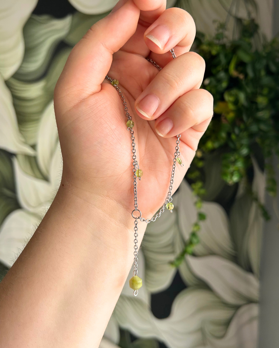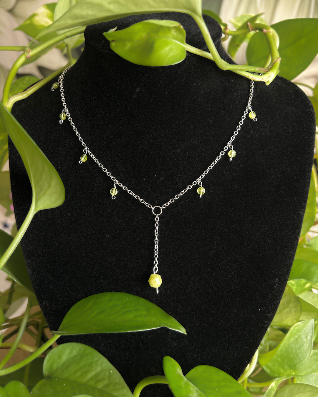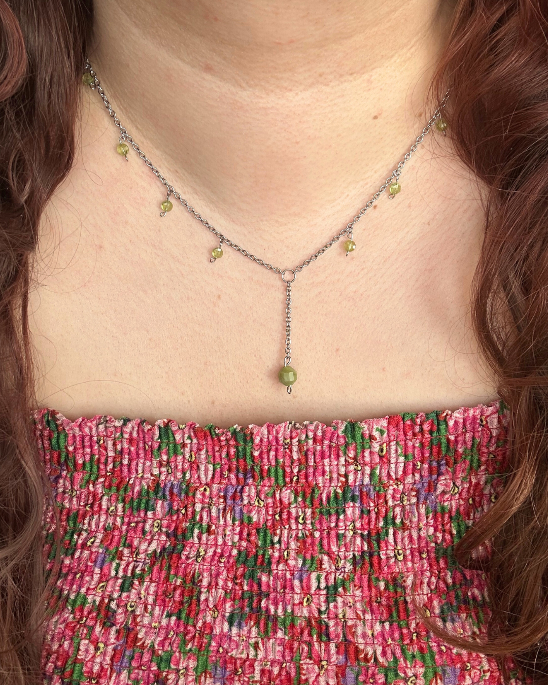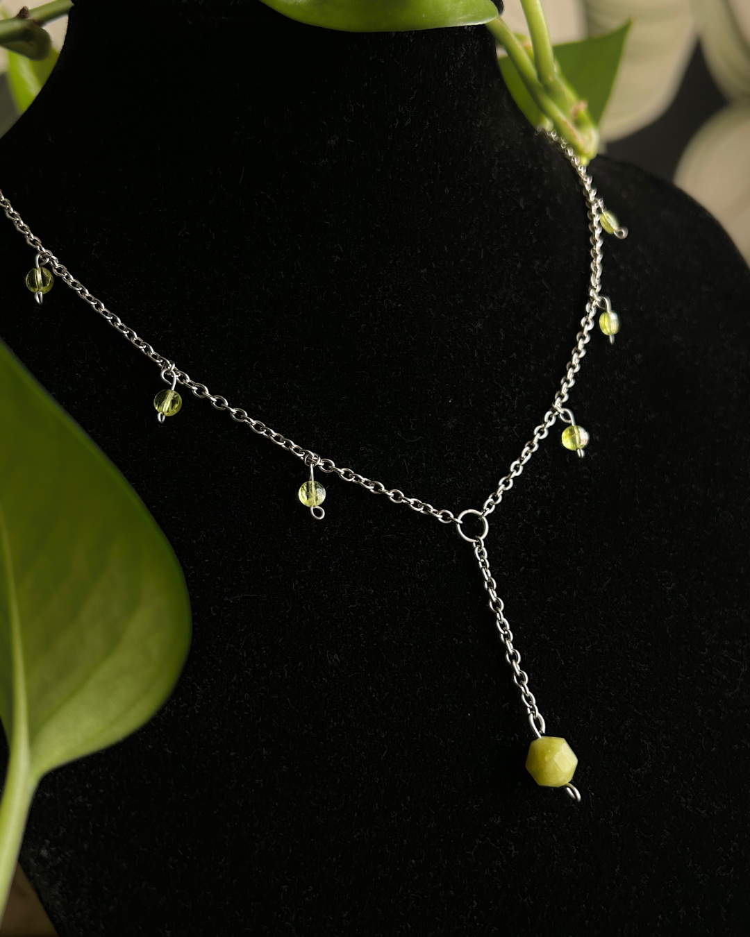 Naszyjnik z kolekcji "Wiosna". Tytułowy motyw kolorystyczny zapewniają fasetowane monetki oliwinu oraz bryłka jadeitu. Naszyjnik ma nietypową, jednak niezwykle elegancką budowę. Pięknie rozjaśni i doda uroku każdej wiosennej (i nie tylko) stylizacji.