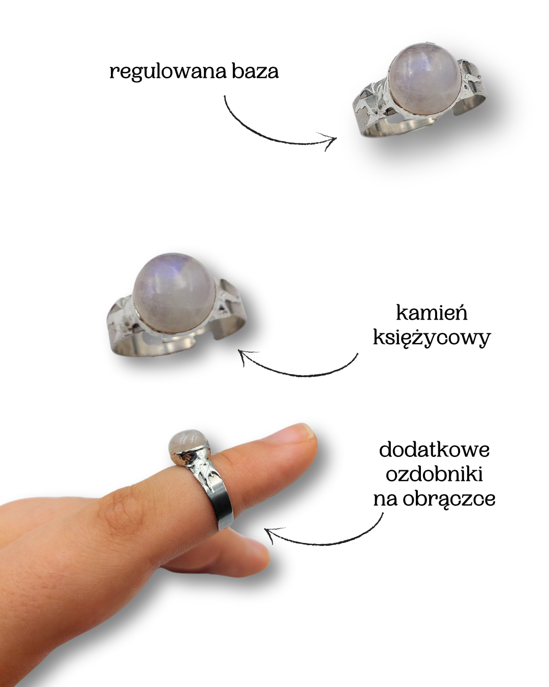 Bazę pierścionka stanowi obrączka ze stali chirurgicznej. Jej średnica wewnętrzna to ok. 1,9cm. Nie jest ona zamknięta, dzięki czemu można ją delikatnie regulować zaciskając lub odginając jej "ramiona".