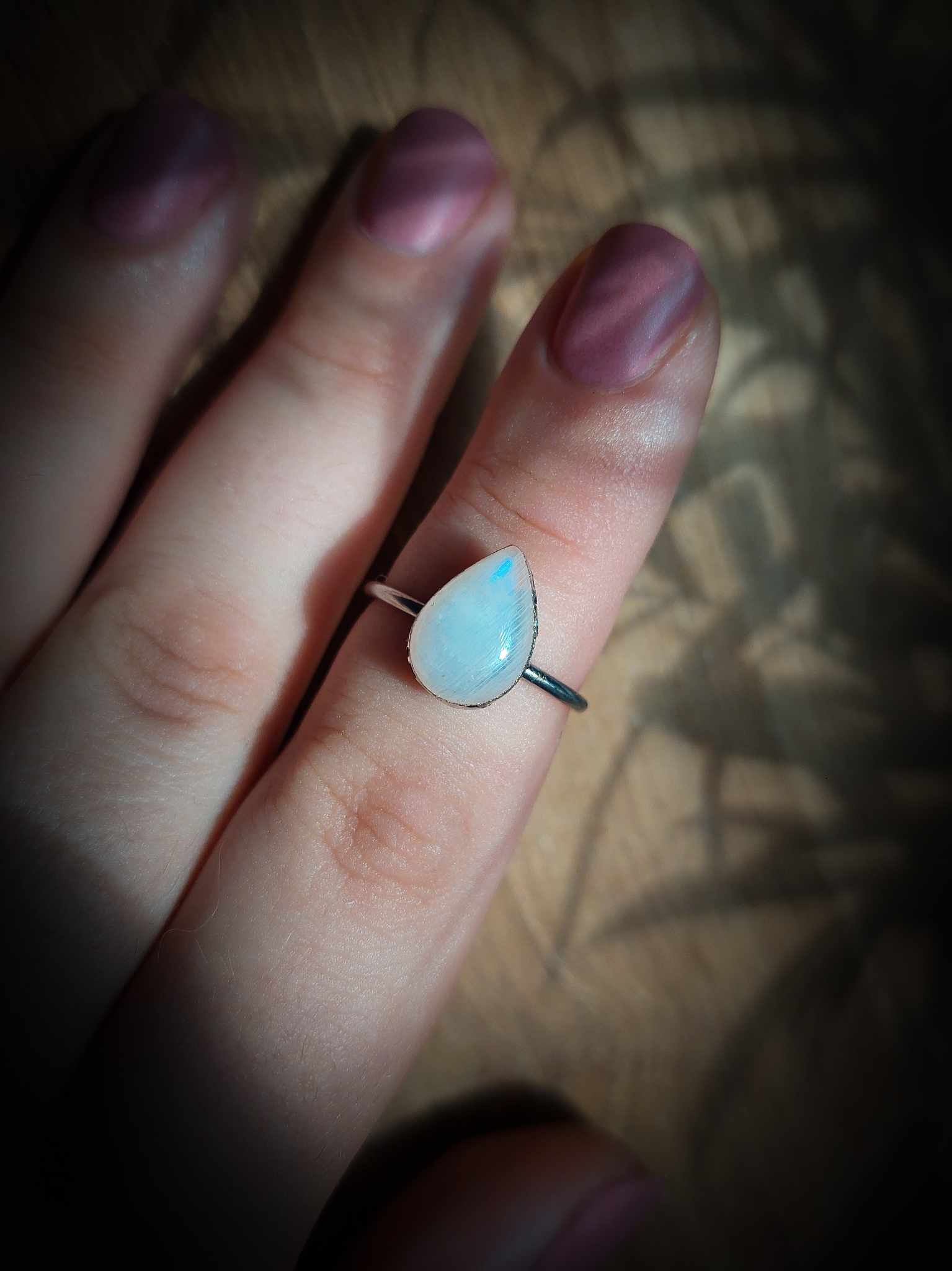 Bazę pierścionka stanowi obrączka ze stali chirurgicznej. Jej średnica wewnętrzna to ok. 1,9cm. Nie jest ona zamknięta, dzięki czemu można ją delikatnie regulować zaciskając lub odginając jej "ramiona".