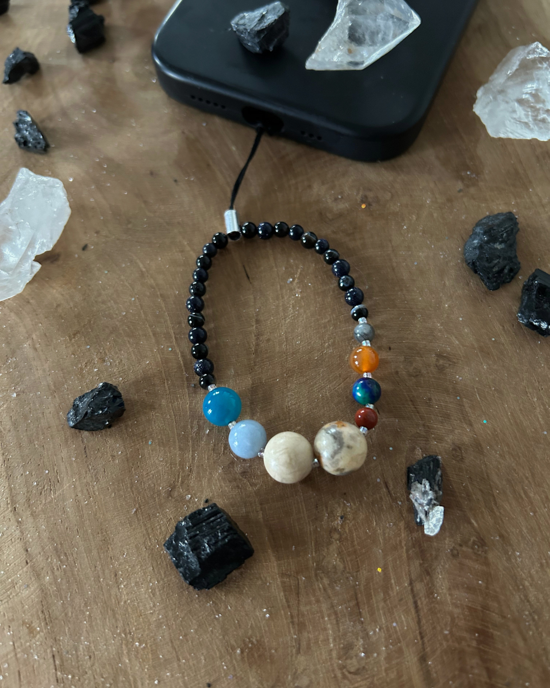 - Koraliki larvikitu, agatu, jadeitu, jaspisu, kamienia rzecznego i angelitu (w rozmiarach od 4 do 10mm) oraz koraliki ze szkła, agatu i nocy kairu